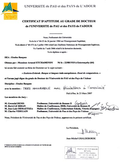 Arnaud ETCHAMENDY dont nous reproduisons ci-dessous le diplôme
